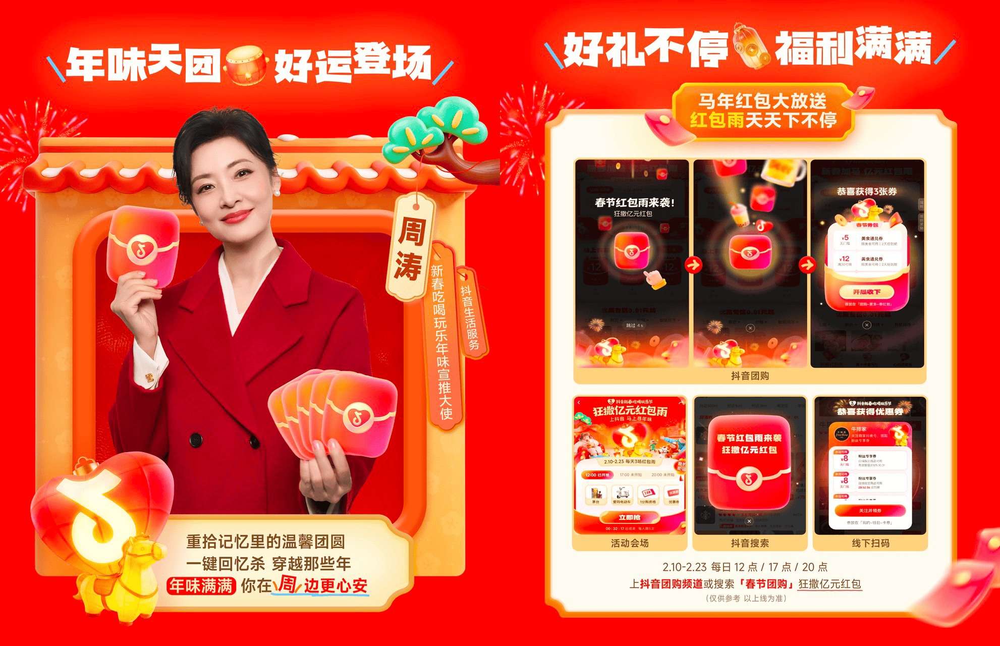 每一份为“年”而生的心意,都值得被丰盛回应。今年,抖音生活服务携手新春吃喝玩乐年味宣推大使周涛,打造「抖音新春吃喝玩乐节」,为你的马年增色添彩。从 2月10日至2月23日,一大波新春好礼持续派送,亿元红包雨、集卡赢豪礼、花样挑战赛……轮番上线,铺开一个惊喜不断的欢乐新年。