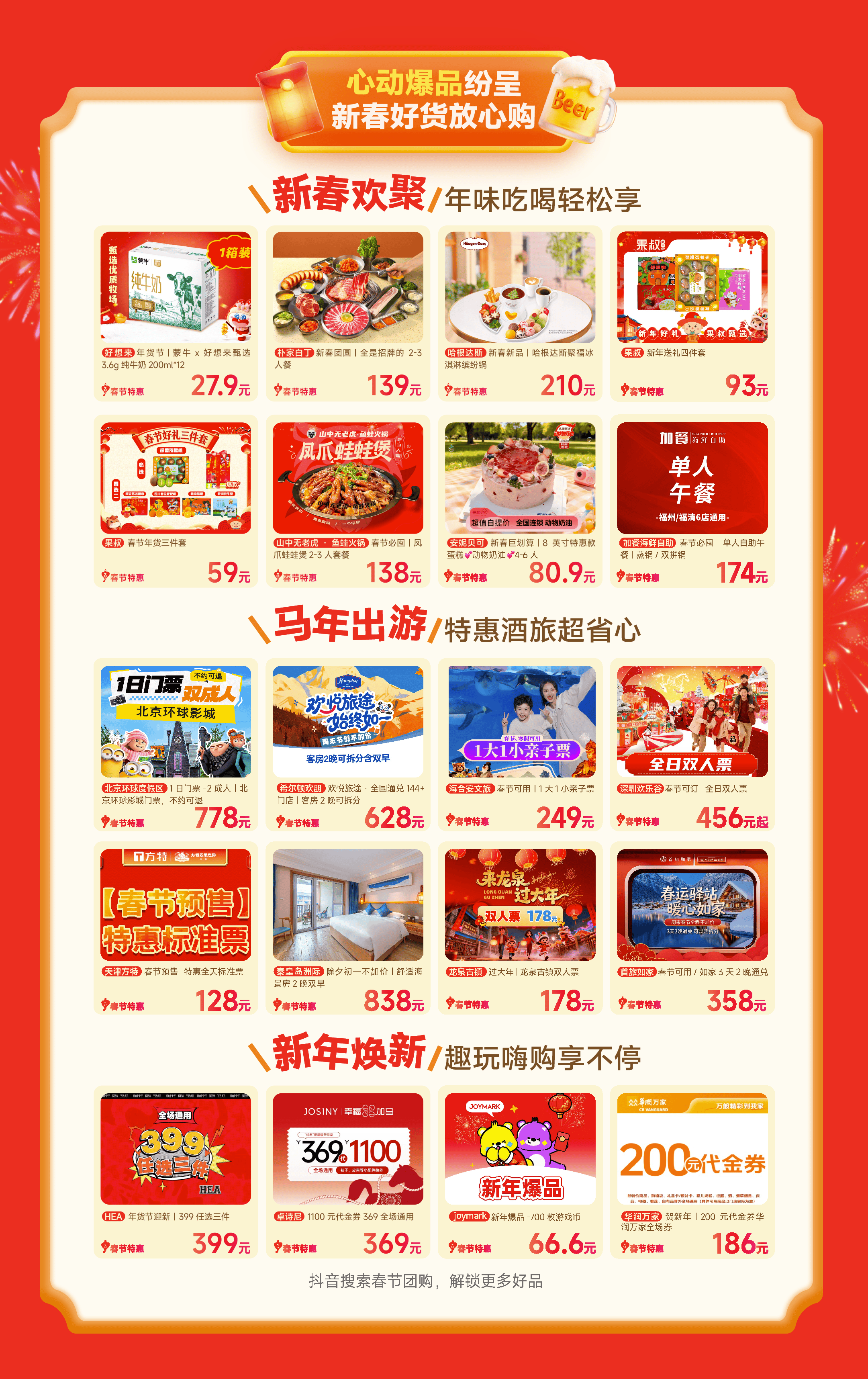 抖音生活服务携手众品牌,打造新春专属礼遇,餐饮、购物、出行游玩等团购好物年味十足,性价比拉满,陪你红火过大年。