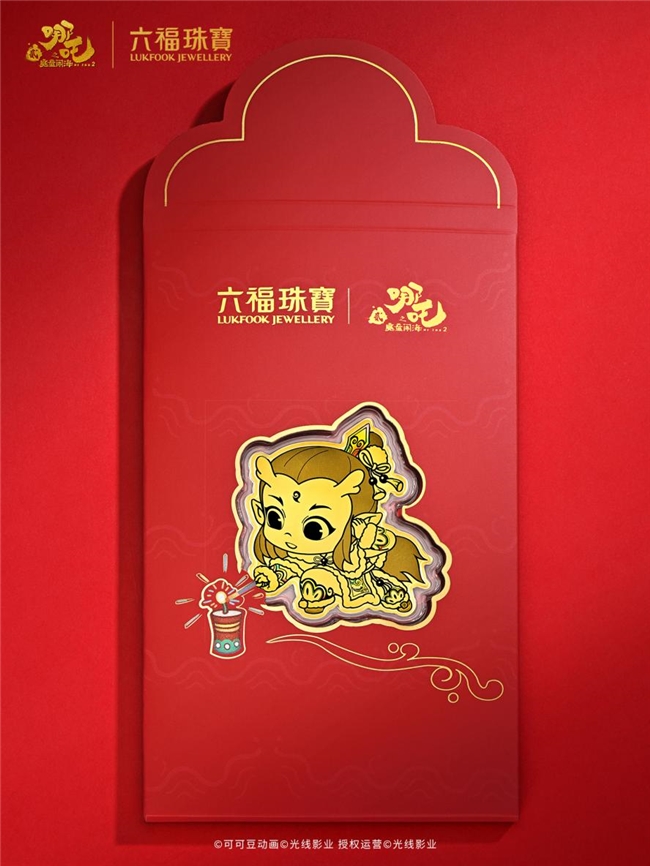 执灯踏福来,好运随身伴。哪吒手执灯笼、欢笑奔跑的鲜活瞬间,步履轻快,灯笼高擎,似在驱散阴霾、照亮前路,尽显少年意气的灵动奔放。将率性洒脱、炽热纯粹的少年英雄,定格于方寸足金之上,匠心雕琢成精致小巧的足金手机贴,以渐变镜面与沙面的分层工艺,搭配微炫彩浮雕的效果,将欢快的动感跃然眼前,丰富的层次让光影熠现活力,绽放璀璨光泽,与“送福上门、好运连连” 的吉祥寓意相映生辉。随赠红包封套的灯笼巧妙连接,以暗纹莲花为底、点缀烟花、鞭炮等喜庆元素,倍添典雅吉祥之感。封套内更附有心意卡,亲手书写的美好祝福,让这枚随身金饰不再是精致的藏品,更是传递情感的温暖载体。