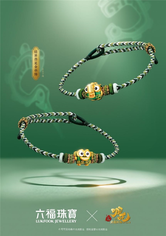 双兽擎珠,结界随形。作为电影《哪吒之魔童闹海》里的“喜剧担当”,萌趣结界兽将无形的守护具象化。以鎏彩点睛一对青铜形象结界兽足金串饰,憨态呆萌的斗嘴形象即刻跃于眼前,并将绿意融入绳纹,宛如结界兽在腕间形影不离,轻声低语,寄以平安顺遂、守护安康的祝愿。