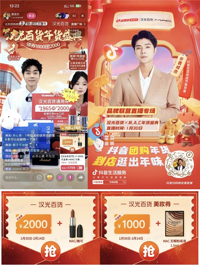 营销玩法不设限,创新更是流量密码。北京核心商圈汉光百货以“年货盛典”为主题,与平台深度合作,打造北方重点城市中首个“国际美妆 综合商场 明星达人”的联营直播模式,整合多方优质资源。汉光联合m.a.c等国际美妆品牌推出专属年味货盘及福袋,贴合北方消费者新春置妆礼赠需求,邀请明星袁成杰打造沉浸式直播。从12月通过西城消费券激活商家,到1月建立平台信任后加大运营投入力度,扫码价值带动三天核销突破700万,后续借品牌、艺人资源撬动直播大场,单场支付超百万,实现声量与销量双突破。