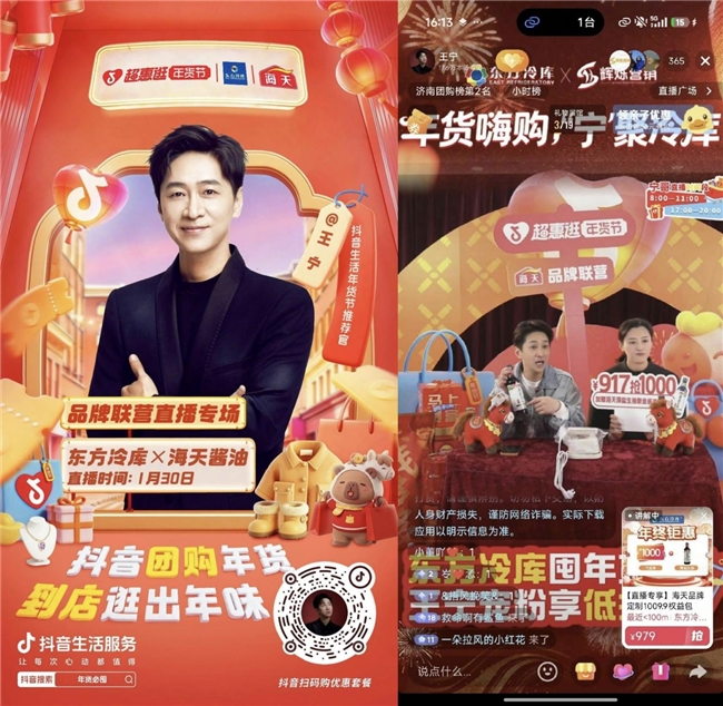 区域连锁商超东方冷库携手国民品牌海天酱油,打造北方地区年味专场直播,精准覆盖区域年货调味品需求。1月30日王宁明星专场单场交易突破500万,东方冷库1月整体交易超千万、创历史新高,成为商超与快消品牌合作的标杆案例。