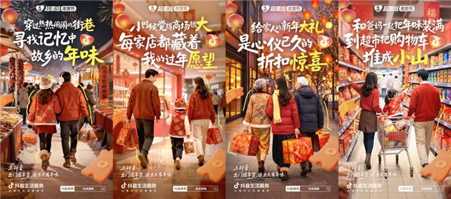 线上通过多维内容造势,引爆全域流量。基于北方用户新春情感需求,设计“北方办年货的专属记忆”等系列年味情绪海报,通过抖音站内等渠道精准投放,强化活动认知。