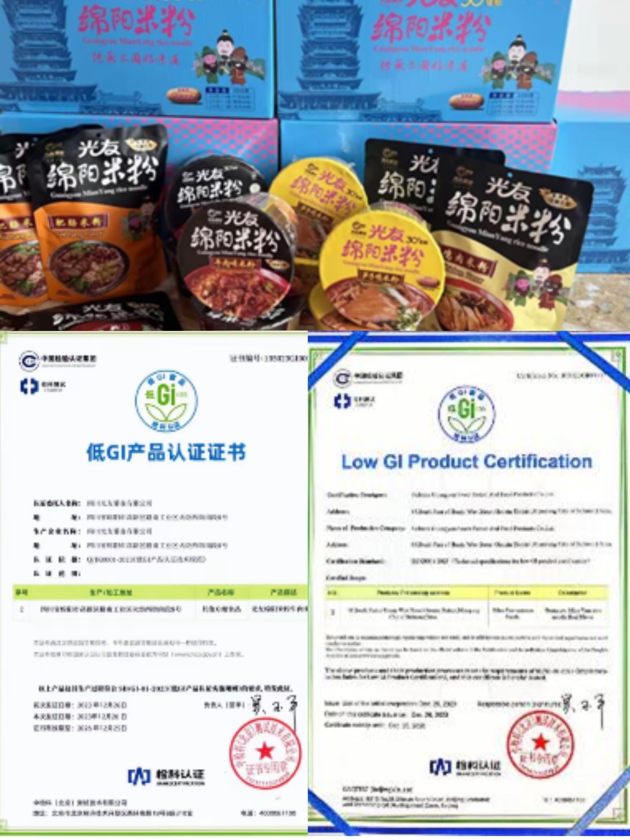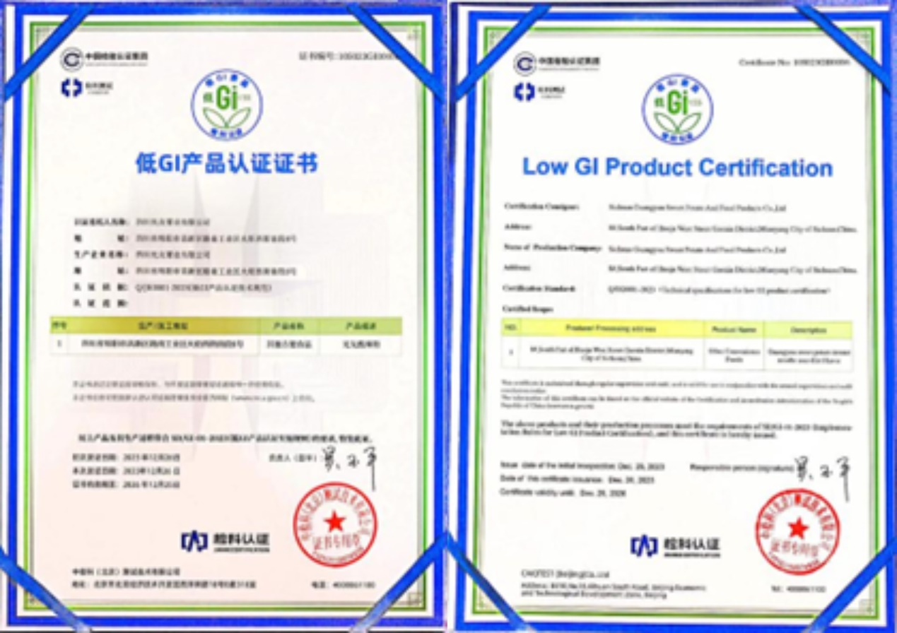 光友酸辣粉、光友绵阳米粉,采用发明专利技术加工而成,经国家检测机构检测及临床试验,认证为低gi健康食品。低gi是低升糖指数,食物在体内被消化吸收后,血糖指数不急剧升高,有助于稳定餐后血糖,控制体重,减少糖尿病等慢性病的风险。低gi食品更健康,符合现代人对健康主食的需求。