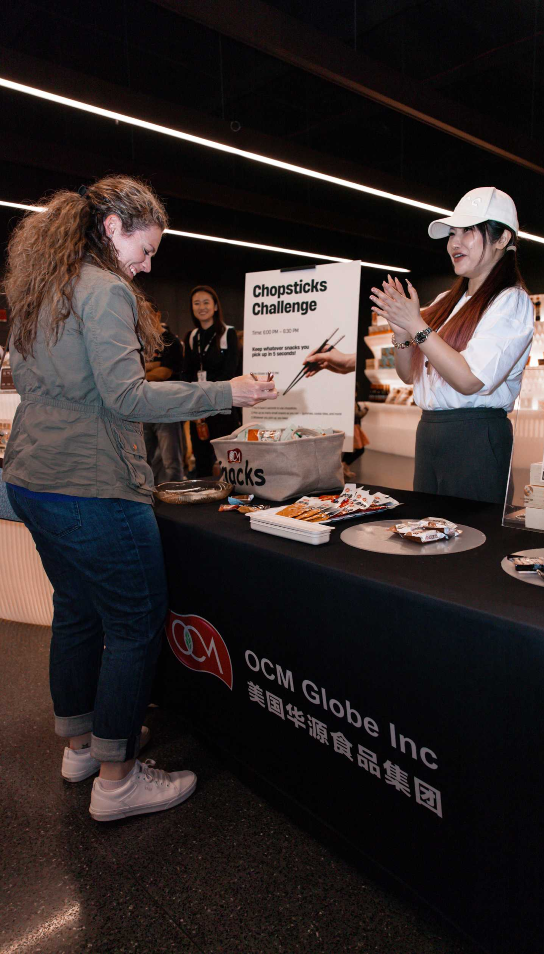 “筷子挑战”互动游戏:活动现场的“筷子挑战赛”(chopsticks challenge)成为焦点,现场观众踊跃参与,体验用筷子夹取糖果和小物的趣味挑战,参与者通过游戏赢取ocm提供的独家礼品,笑声不断。