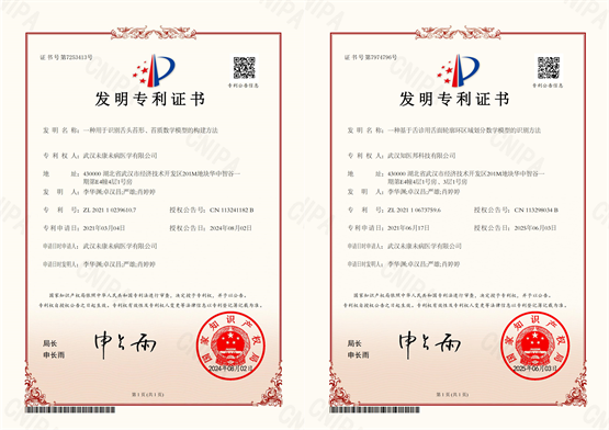 (知医邦发明专利证书:《一种用于识别舌头苔形、苔质数学模型的构建方法》、《一种基于舌诊用舌面轮廓环区域划分数学模型的识别方法》)