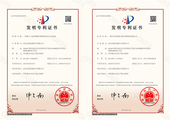 (知医邦发明专利证书:《一种基于气血津液数学模型的看舌头的系统》、《一种舌诊寒热虚实数学模型的构建方法》)
